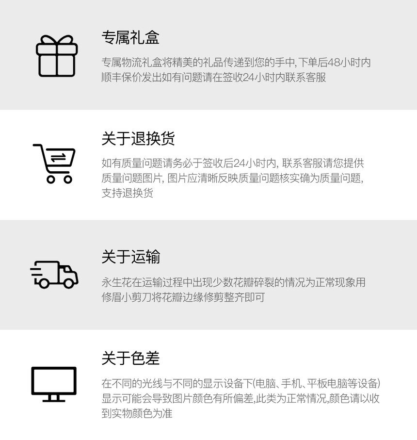 温馨提示 1、「BESTINE 柏治廷」永生花产品均为纯手工制作,收到商品后若因物流颠簸导致少许花瓣脱落均为正常现象,请打开保护罩清理干净即可,不会影响商品质量,敬请谅解; 2、产品图片均为实物拍摄,可能会因不同光源、不同显示器等原因存在细微色差,实际产品颜色请以实物为准。