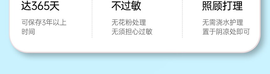 商品养护 1、适合放在干燥、温度适宜的封闭环境下保存; 2、永生花无需浇水养护请避免阳光直射、高温、潮湿、大风等不稳定环境下存放; 3、请勿经常用手触碰花朵,避免永生花发生变形; 4、若花瓣呈现半透明状态,请及时转移至干燥环境使其恢复原样。